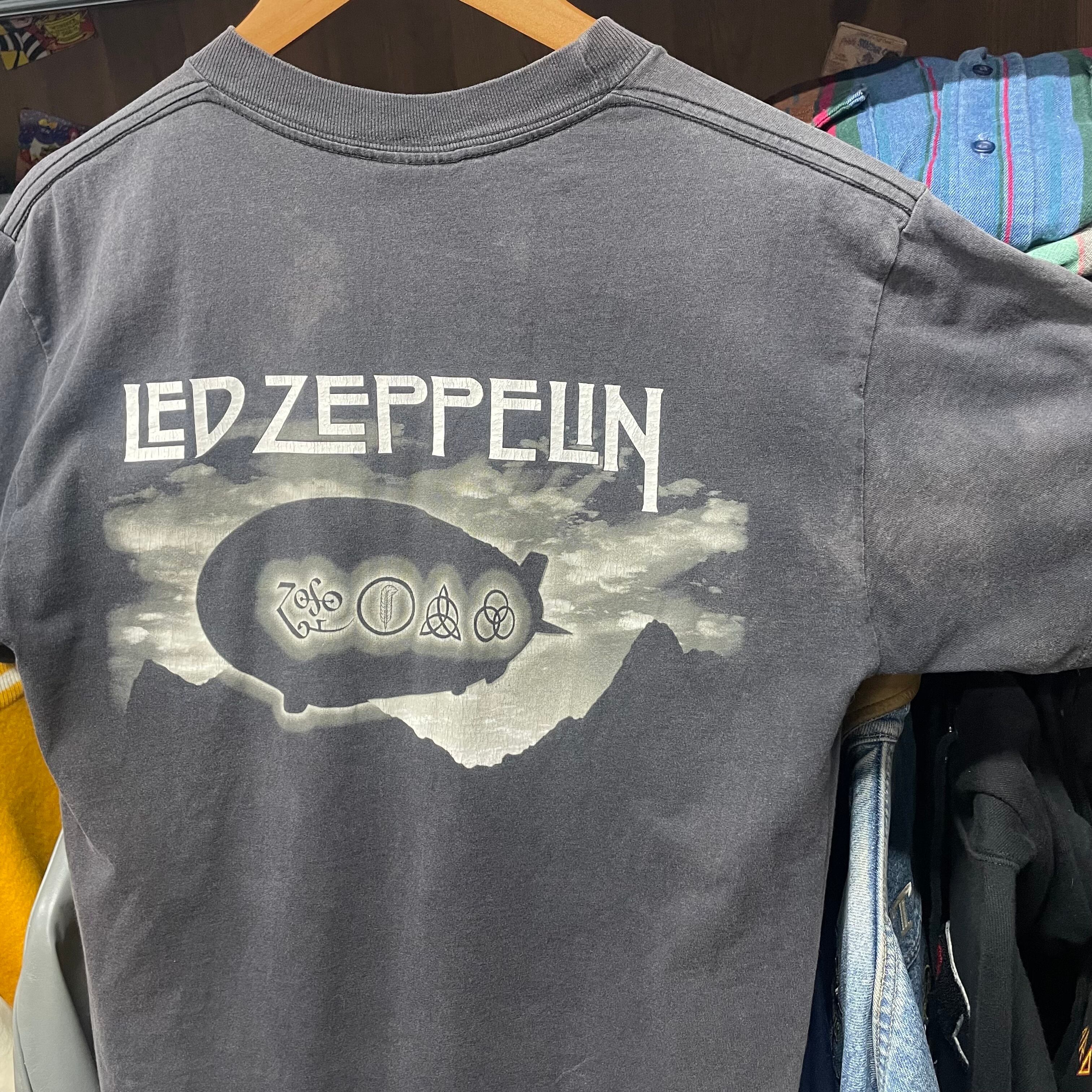 伝説的なロックバンド、レッド・ツェッペリンの象徴的なモチーフである飛行船と、メンバー4人を象徴するシンボルマークがプリントされたバンドTシャツです。ボディはヴィンテージ市場で人気の高いWINTERLAND(ウィンターランド)製で、フェード感のあるチャコールグレーの色味が雰囲気抜群の一着となっています。フロントには夜景の上を浮遊する鮮やかなグラフィック、バックにはシルエットのデザインが施されており、両面プリントを楽しめる仕様です。裾付近にダメージが見受けられますが、ヴィンテージ古着特有の味として、ロックなスタイリングに最適なアイテムです。