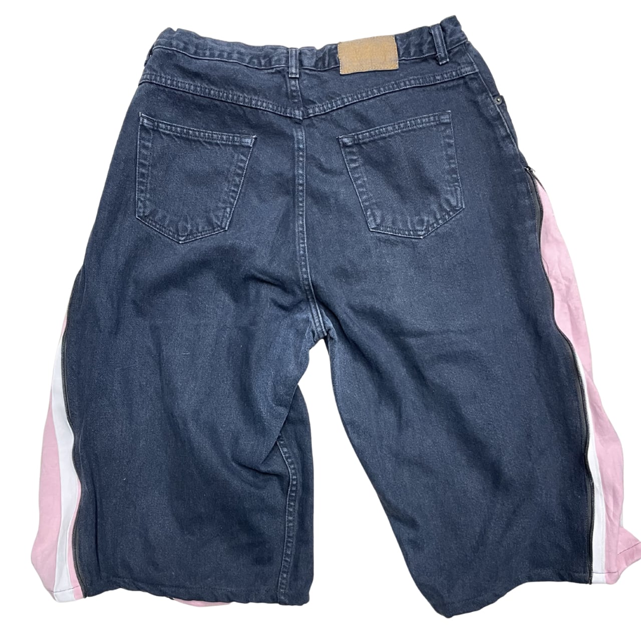 デニムをベースに、トラックパンツの生地をサイドに切替えたリメイククロップドパンツです。
