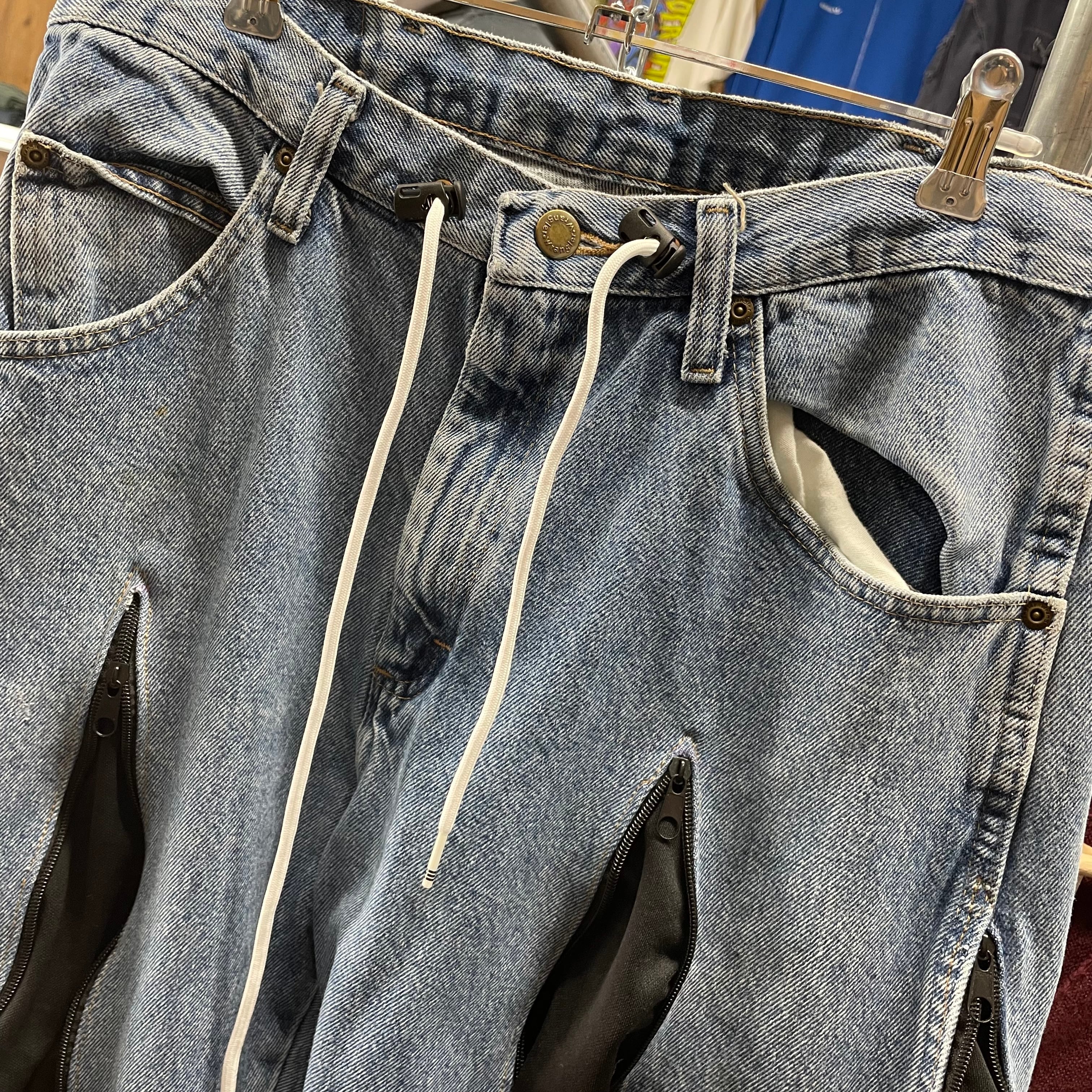 スポーティーな素材感とデニムの無骨さをミックスした一点物デザイン。