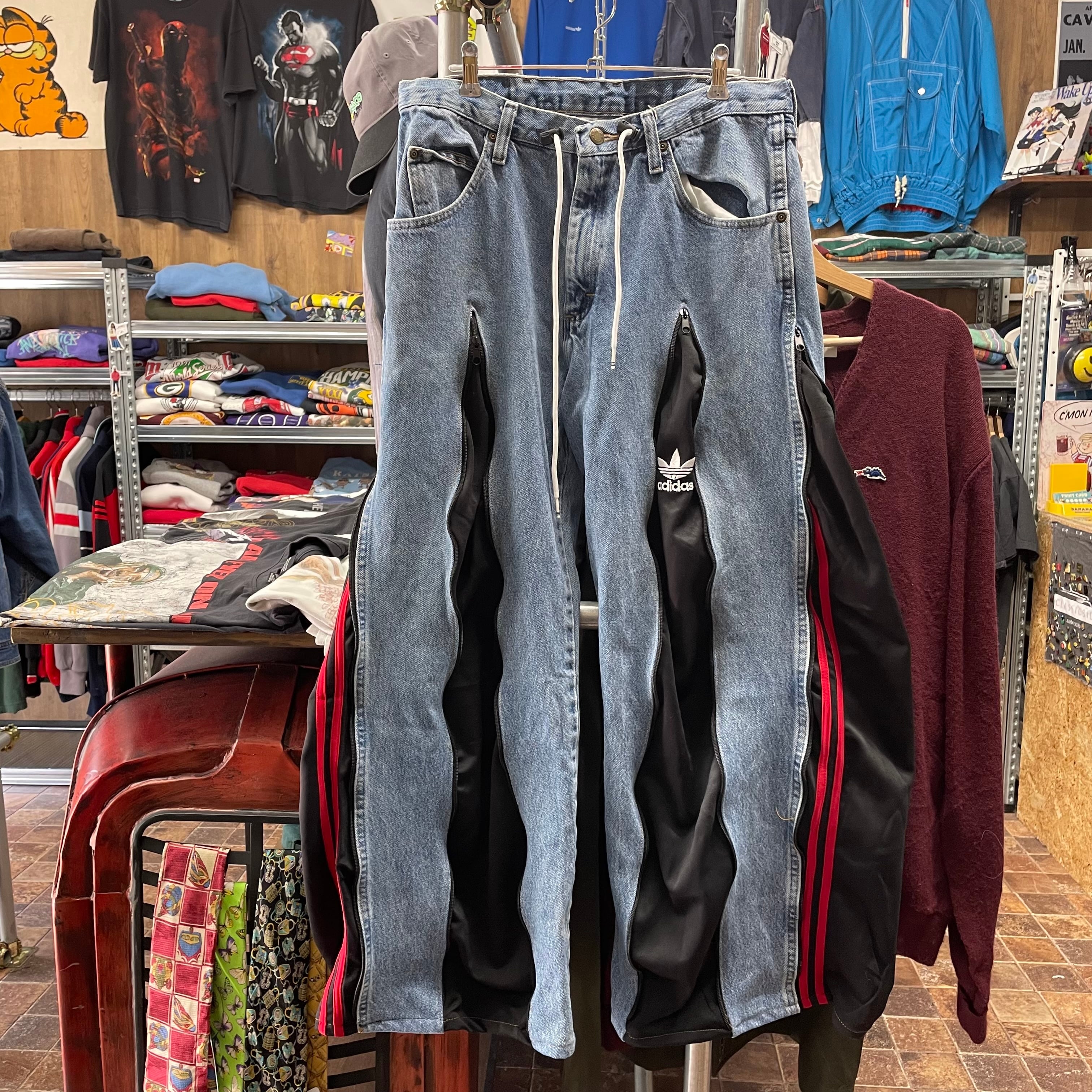 デニムをベースに、トラックパンツの生地をサイドに切替えたリメイクパンツです。