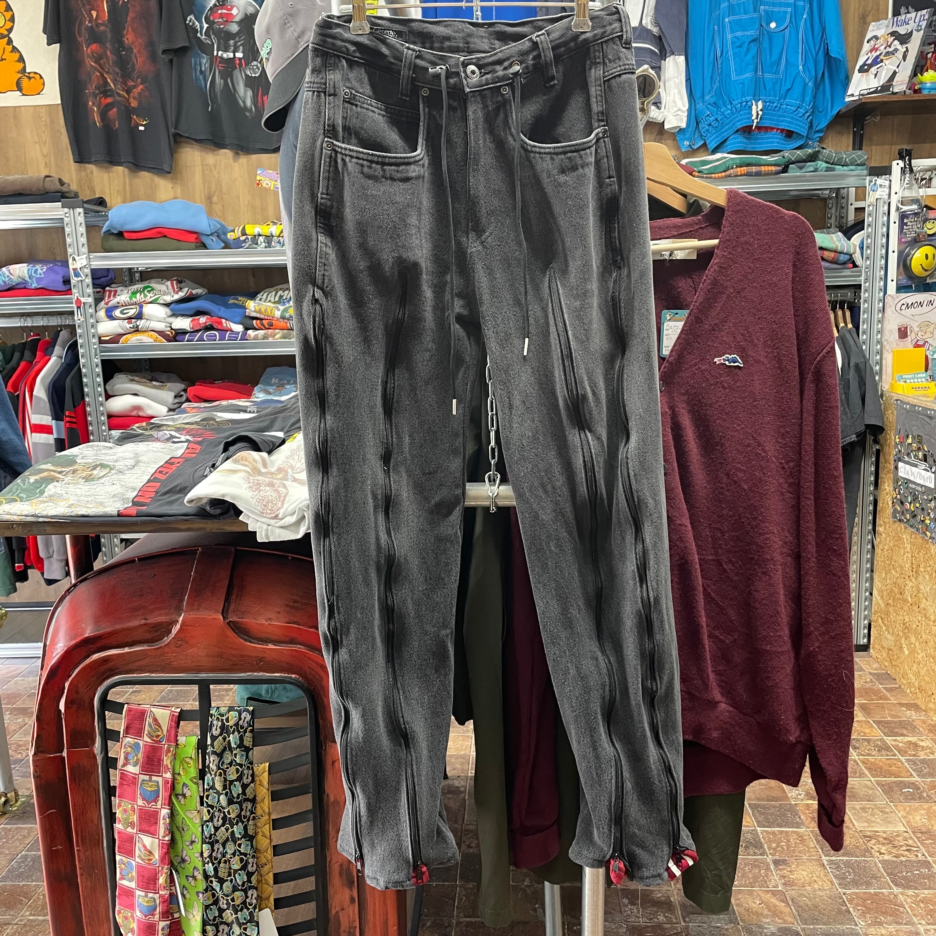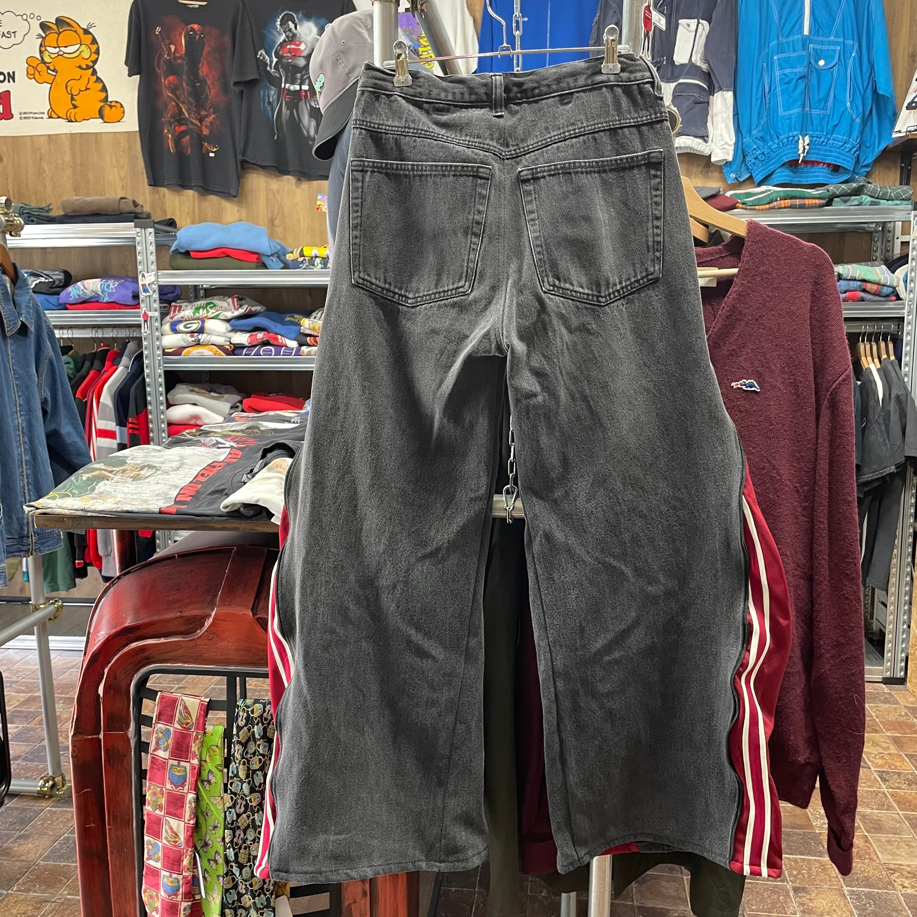デニムをベースに、トラックパンツの生地をサイドに切替えたリメイクパンツです。