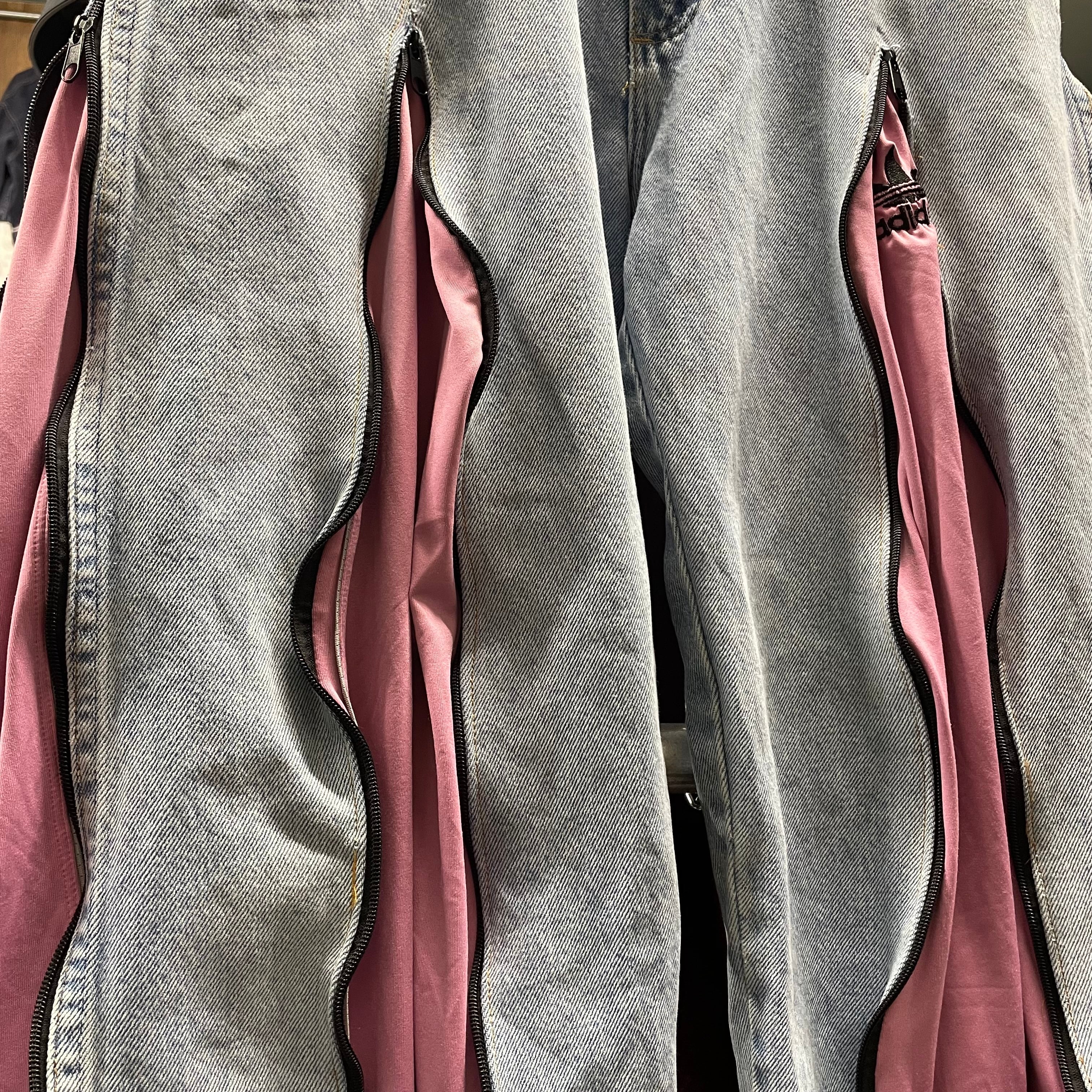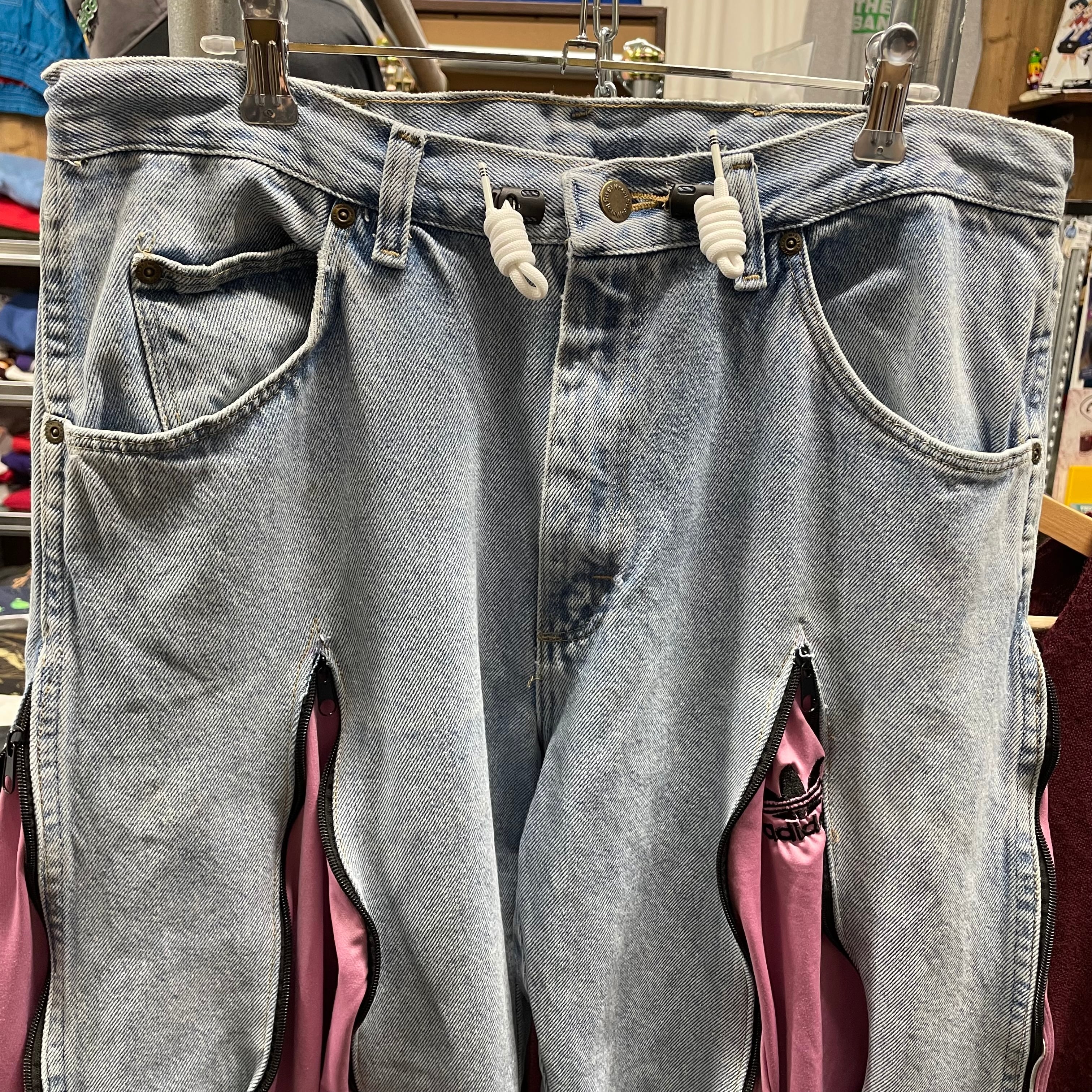デニムをベースに、トラックパンツの生地をサイドに切替えたリメイクパンツです。