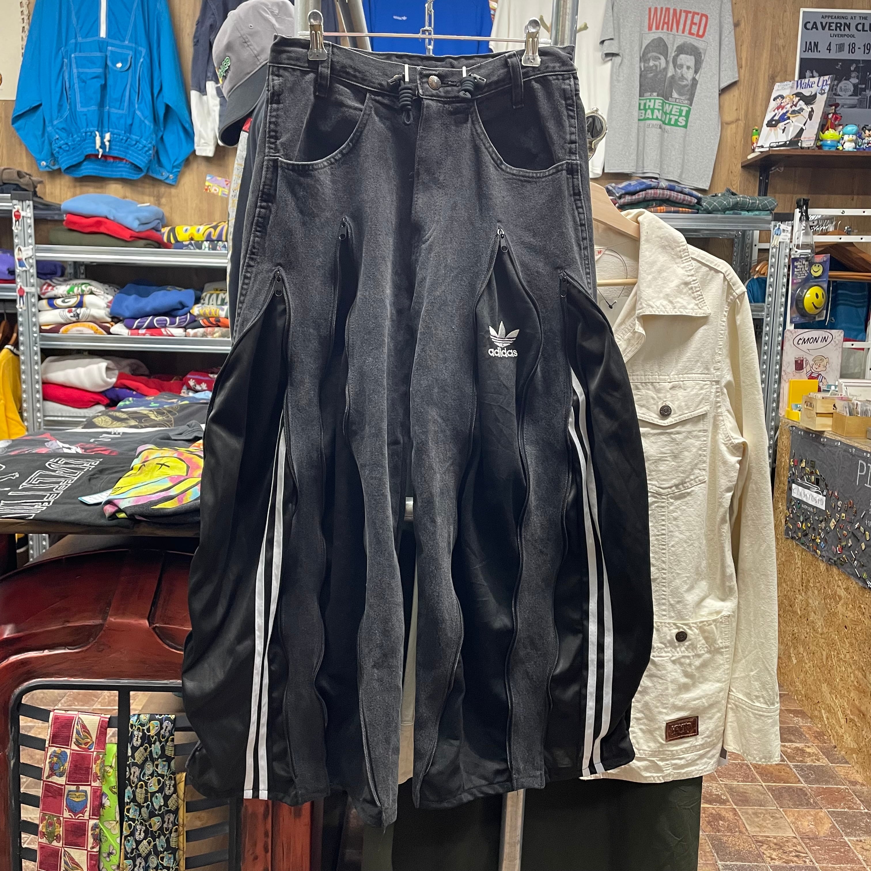 デニムをベースに、トラックパンツの生地をサイドに切替えたリメイクパンツです。