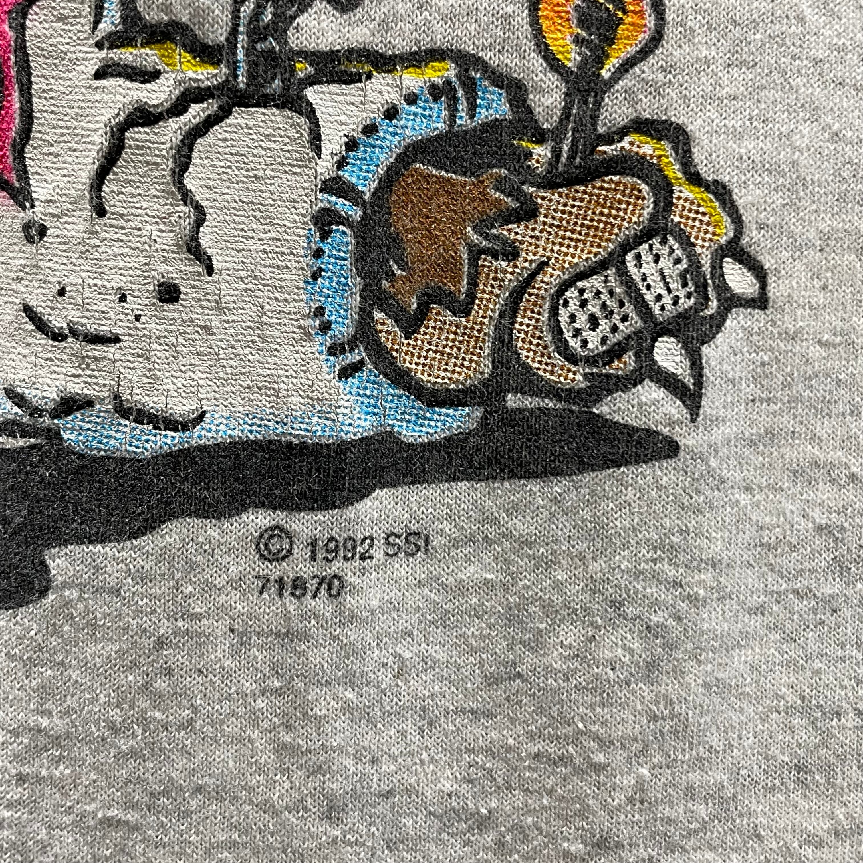 1992年のコピーライトが入る、90年代ストリートの空気感を象徴するようなメッセージヴィンテージTシャツです。ボロボロになったクマのキャラクターとともに描かれた「DISCOVER WILDLIFE, HAVE KIDS」というパンチの効いたフレーズは、当時のアメリカらしいブラックユーモアとシニカルなセンスが凝縮されており、現代のファッションにおいても圧倒的な個性を放ちます。ボディは古着ファンからの信頼も厚い「SSI」社製の米国製(MADE IN USA)で、肉厚で柔らかな霜降りグレーの質感は、現行品では決して味わえないヴィンテージ特有の奥行きのある表情を見せてくれます。袖・裾ともにシングルステッチ仕様、ゆったりと肩を落として着られるLサイズという好条件に加え、多色使いの豪華な大判プリントがコーディネートに確かな重厚感を与えてくれる逸品です。単なるプリントTシャツの枠を超えた、90sサブカルチャーの資料的価値も備えたこの一着を、ぜひ日々のスタイリングの主役としてお楽しみください。