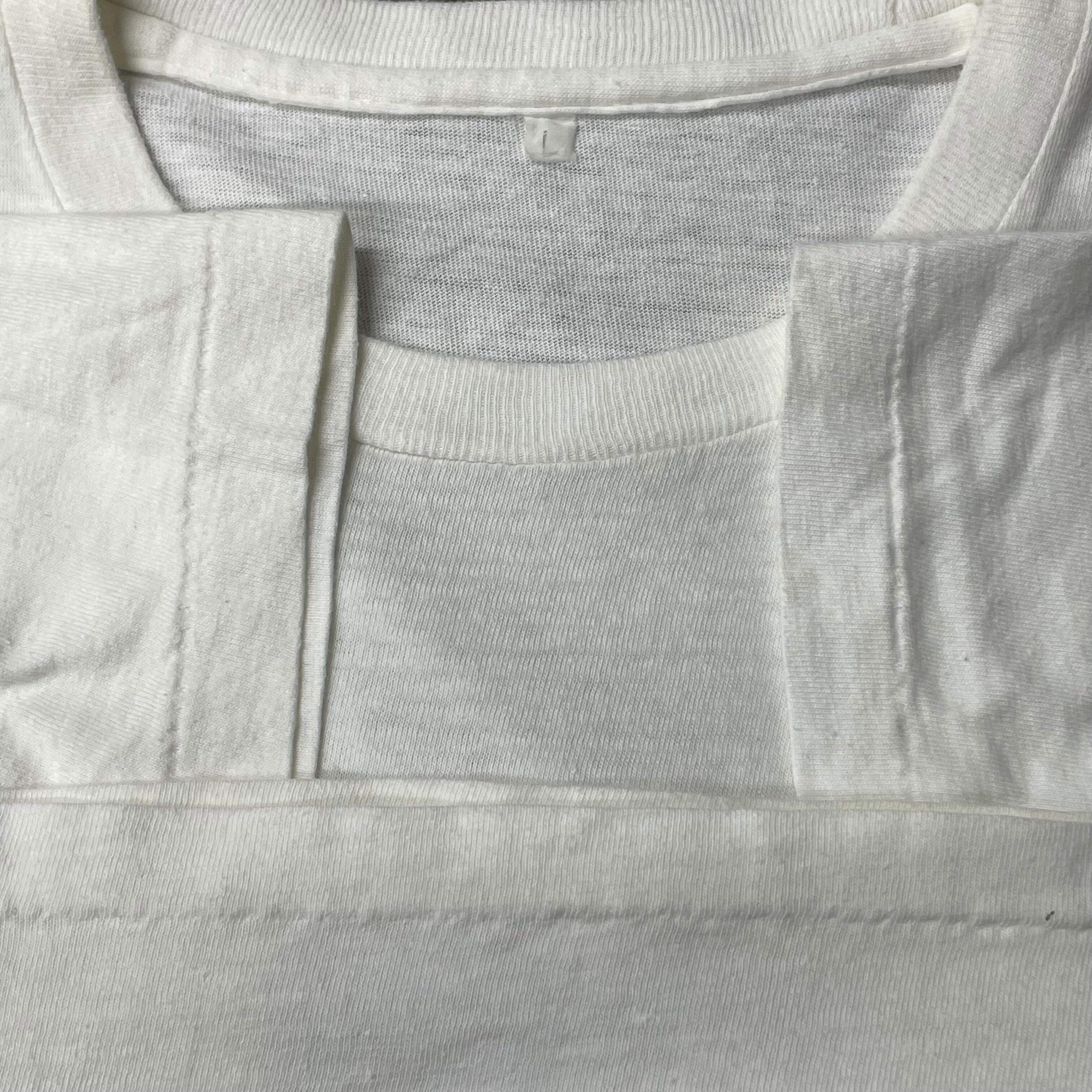 特筆すべきはこのボディの質感で、経年変化によって程よく薄れたプリントの掠れ具合と、現代の既製品では到底出せないクッタリとした生地の落ち感が絶妙なバランスを保っています。シングルステッチ仕様の袖口や裾など、ヴィンテージファンが求めるディティールもしっかりと押さえられており、サラリと一枚で着るだけでスタイリングに奥行きと遊び心を与えてくれます。