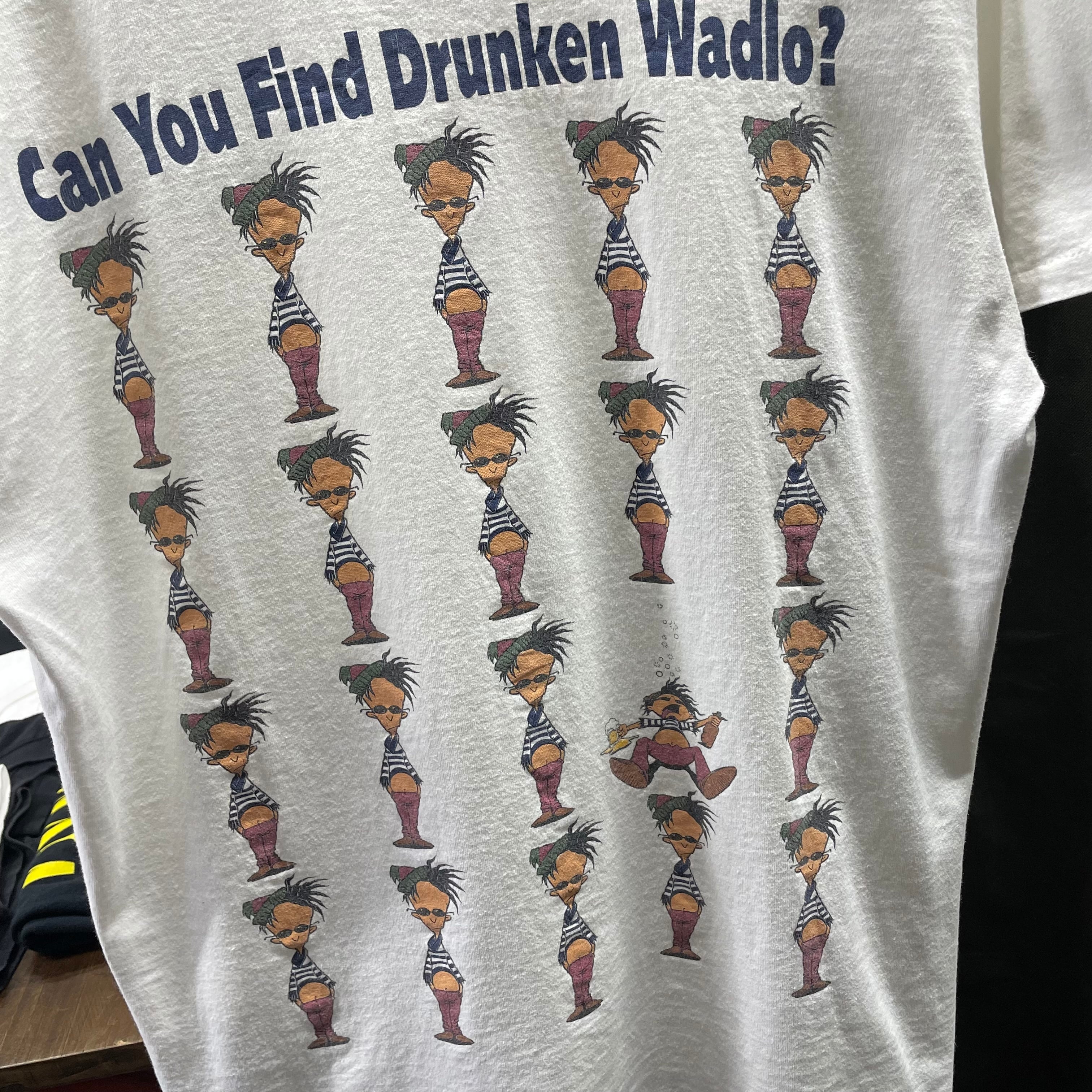 バックにずらりと並んだ、どこか虚ろな表情の「Wadlo」たちの中から、たった一人の酔っ払いを探し出すというシュールな設定。フロント胸元にもさりげなくロゴが入り、シンプルながらも背中で語るデザインのギャップがたまりません。ボディには信頼の「Badger Sportswear」を採用しており、アメリカ製特有のタフな質感と、ドライな肌触りがヴィンテージ好きには堪らないポイントです。